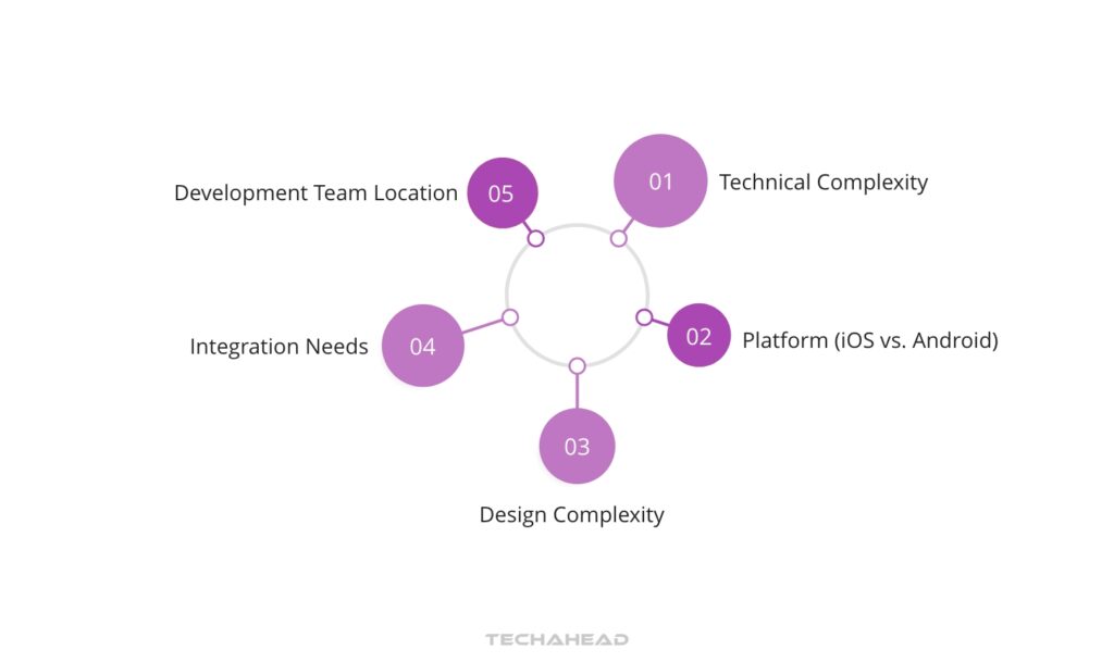 5 primary factors, that influence the overall mobile app development cost Los Angeles are: technical aspects, design and UI/UX, integrations, platform selected and the location of the development team.