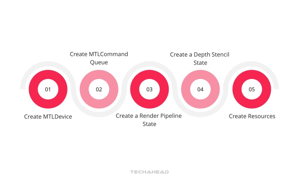 - Create an instance of ‘MTLDevice’ to interact with the GPU.