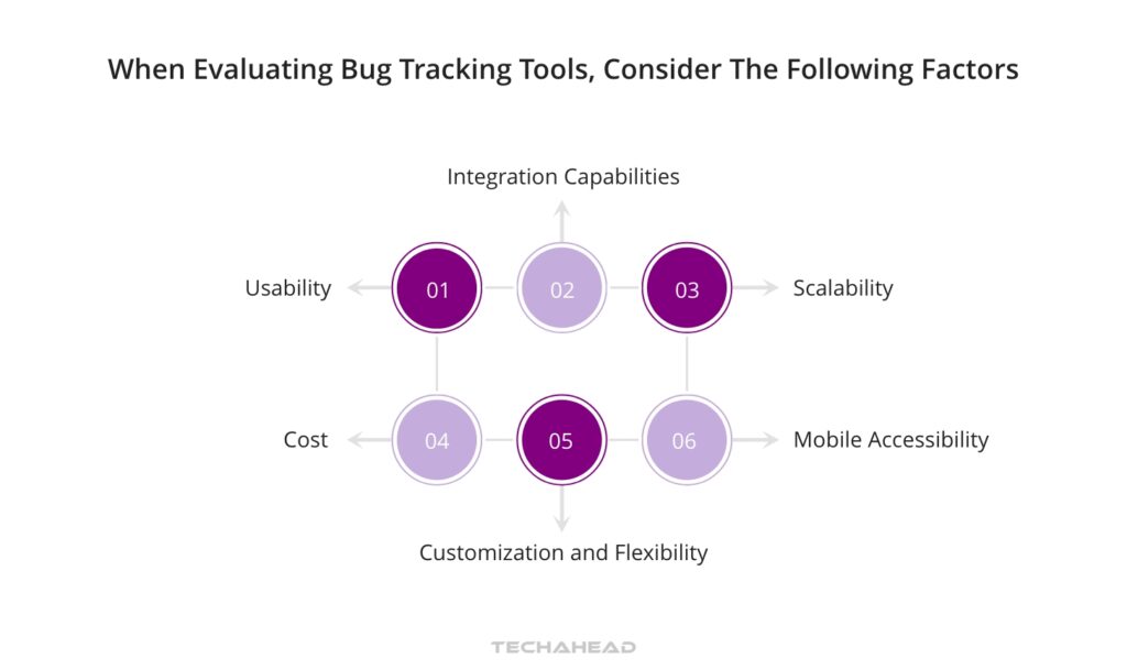 When evaluating bug tracking tools, consider factors such as usability, integration capabilities, scalability, cost, customization and flexibility, and mobile accessibility.