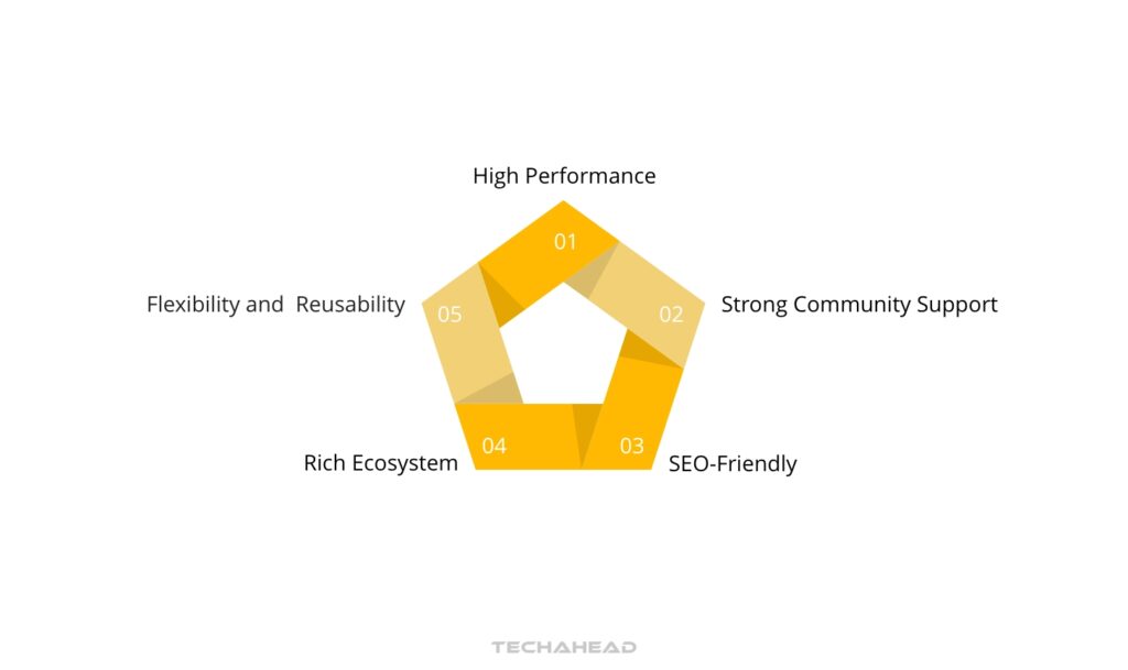 Built on React, Next.js benefits from React’s component-based architecture, making it easier to build and reuse components across different pages and applications. This helps keep your code organized and scalable.
