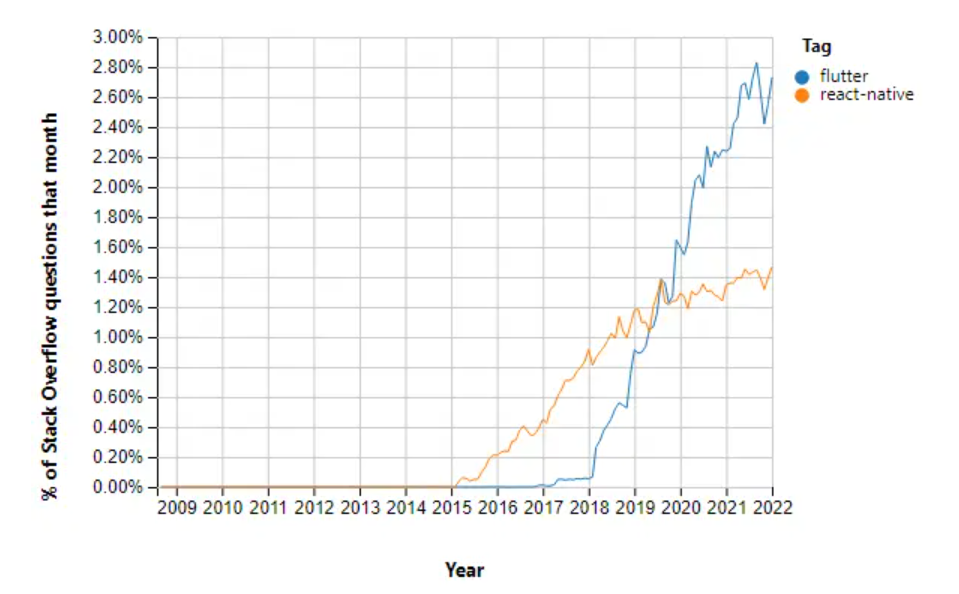 A graph from Stackoverflow shows why Flutter exponentially rises in popularity, and also the features making it so advantageous for developers.