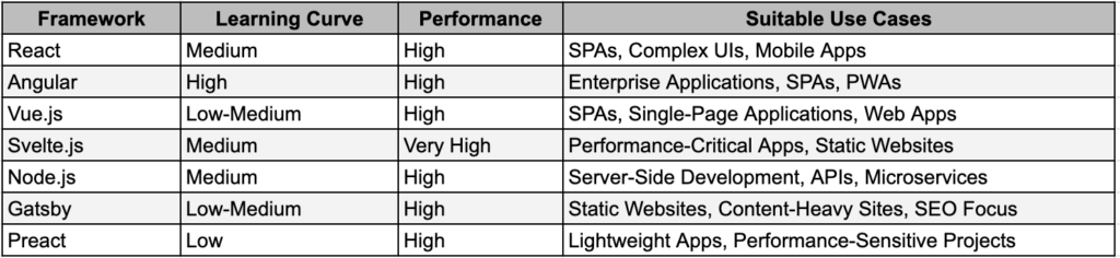 Learning curve: If you’re new to JavaScript, Vue.js or React offer a good balance between power and ease of learning.